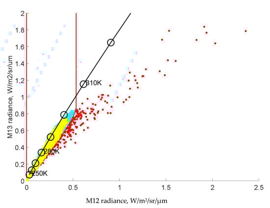 - Define the Cartesian coordinate system (M12, M13), in which the radiance values in band M12 are plotted along the horizontal axis and M13 along the vertical axis.