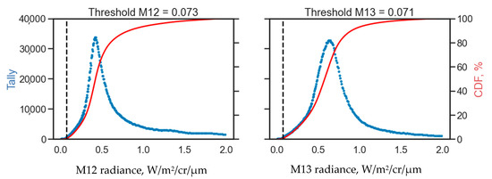 The adaptive nature of the MWIR scattergram detector makes it difficult to define its sensitivity in terms of absolute radiance thresholds. However, we can statistically “reverse engineer” the thresholds using quantiles of the cumulative probability function (CDF) of the radiances in the M12 and M13 bands over a long period of time.