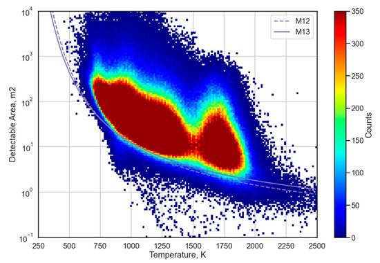 With Planck’s law, we can interpret the detection limits of our algorithm in terms of the temperature and source area of the detected heat source. The central wavelength of the M12 and M13 bands and their radiance detection limit were used as constraints. Then, the minimum detectable source area can be estimated by varying its temperature. Figure 8 shows a scattergram of the temperature versus the source area for one year of operational VNF detections, together with the resulting detection limit lines.
