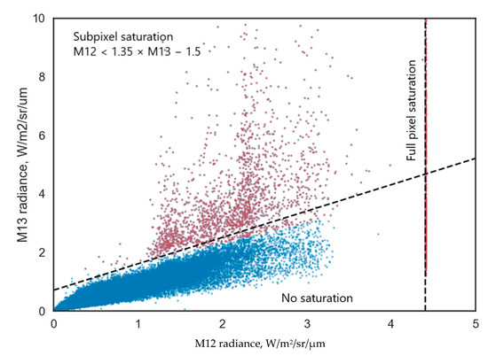 - Pixels with large IR emitters can saturate the sensor, particularly in the M12 band, which has a lower saturation radiance compared to M13. Pixels can either be fully saturated in M12, or they can be partially saturated [1]. For each remaining pixel, determine if its values in channels M12 and M13 are near the sensor saturation limit (limit values that the sensor can measure). If so, then the given pixel is noise and is removed from the candidate detection set.