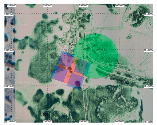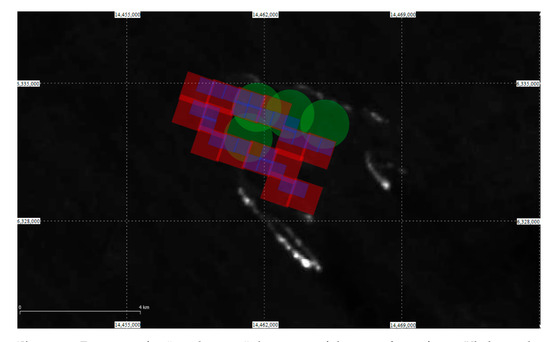 Footprints of the “mutual” detections of the same gas flare in Khanty-Mansiysk at 61.809N 77.237E in EPSG:900913 projection observed with three satellites on 23 August 2015. Daytime background comes from satellite view in Google Maps.