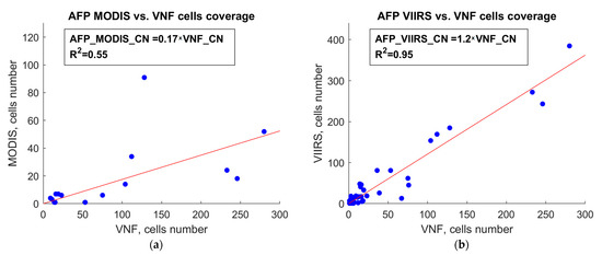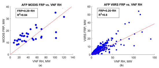 Comparison of VNF and AFP by radiative power from forest fires: (a) VNF vs. MODIS AFP; (b) VNF vs. VIIRS AFP.