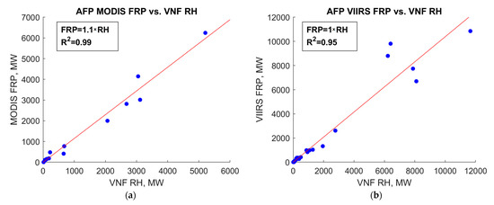 Figure 17 shows the comparison of VNF and AFP radiative heat estimates for forest fires. The red line in both plots shows regression through zero. In both cases, the correlation level when comparing VNF with both MODIS AFP and VIIRS AFP is high (R2 > 0.95), and the regression coefficient is close to one.