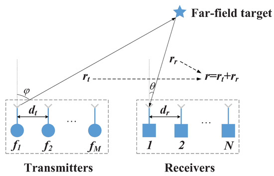 Assume K targets in the far-field. DOA, DOD, and range of k-th target are written as , , and . The data of the k-th target received by n-th receiving antenna can be defined as [19,32]