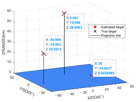 Figure 3 and Figure 4 prove the effectiveness of the developed algorithm, where dB and . Figure 3 demonstrates the spatial spectrum of DOA. It can be seen that DOA estimation is accurately achieved through spatial spectrum searching. The spatial spectrum of the proposed algorithm is clearer and more accurate than that of MUSIC algorithm, and has more sharp peaks. We can know from Figure 4 that our method can accurately obtain the DOA, DOD, and range information of three targets. It can testify the availability of our method.