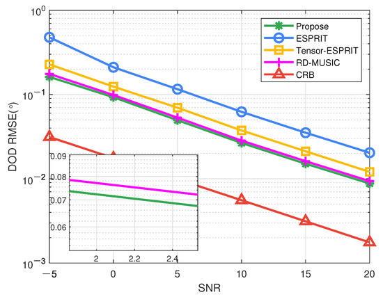 For exploring the impact of different SNR on the precision of the algorithm, the first group of comparative tests is proposed, where . Figure 7, Figure 8 and Figure 9 show the comparison of DOA-DOD-range estimations of different methods. From this set of comparative experiments, we can see that our method has superior precision than other algorithms in DOA, DOD, and range estimation, and nearer to the CRB. This is because the developed algorithm takes advantage of the multi-dimensional structure of data, and can obtain accurate estimations through spectral peak searching. On the one hand, the accuracy of our method in DOA and DOD estimation is very close to that of the RD-MUSIC, but the computational redundancy is reduced. On the other hand, in terms of range estimation, since the subarray division can more accurately decouple the range information and DOD information, more accurate range estimation can be obtained. Moreover, the accuracy of tensor ESPRIT is more accurate than that of ESPRIT due to the use of multi-dimensional structure characteristics.