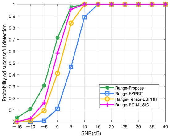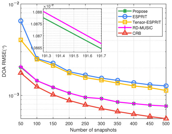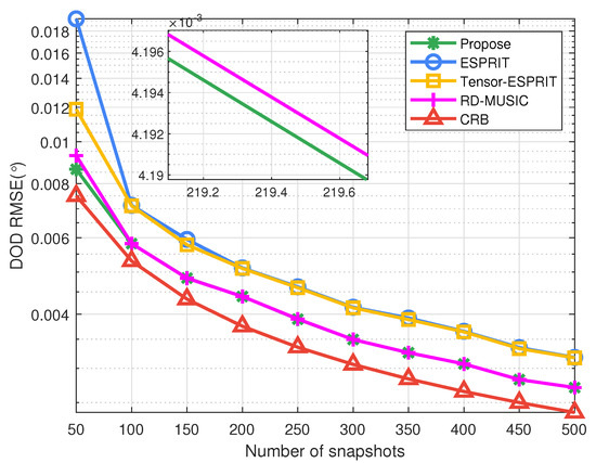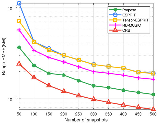 The second group of experiments confirms the advantage of our algorithm under different snapshots, where dB. From Figure 10, Figure 11 and Figure 12 we can know that DOA-DOD-range estimation accuracy of the developed algorithm are higher to the other algorithms. Moreover, the estimation accuracy of the developed algorithm is more stable in the case of low snapshots. It is because our algorithm utilizes high-dimensional data to improve the performance under small snapshots. In terms of DOA and DOD estimation, the performance of our method is slightly better than that of the RD-MUSIC. However, in range estimation, the accuracy of our method is higher to the RD-MUSIC because the subarray division solves the coupling problem of the transmitter. Moreover, the precision of tensor ESPRIT algorithm is obviously higher than ESPRIT algorithm in small snapshots. With the increase in snapshot, the precision gap between the two methods will gradually decrease. That is to say, the accuracy of the two algorithms is very close in high snapshots. Only the precision of our method is nearer to CRB curve. This demonstrates the superiority of our method.