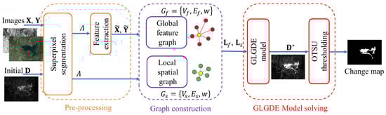 In order to address the above challenges, in this paper, we propose a global and local graph-based DI-enhancement method (GLGDE) for CD problems. It is a plug-and-play approach for the post-processing of DI, which can be applied to the homogeneous CD of optical images and SAR images and heterogeneous CD. Specifically, once the initial DI is obtained, e.g., a coarse DI is obtained by using the methods introduced in the related work, we smooth and correct the DI by the following steps. Firstly, we co-segment the DI and multi-temporal images into superpixels with the same shape and boundaries and then extract the features of the images. Second, we construct two graphs for the DI with superpixels as vertices; one connects each vertex and its similar vertices in the multi-temporal images to exploit the association between the similarity relationships of the multi-temporal images and the changing states of the DI and the other connects each vertex and its neighboring vertices in the local spatial neighborhood to capture the local structure information of the DI. In the constructed graphs, the edge weights not only exploit the change information and contextual information of the DI but also the correlation information of the original multi-temporal images, which is crucial for correcting and smoothing DIs. Third, based on the constructed graphs, we propose a DI-enhancement model that contains three constraint terms: a global feature graph-smoothing regularization term, a local spatial graph-smoothing regularization term, and a change data-regularization term. By solving the minimization model, we can obtain the improved DI. Finally, the binary CM can be easily obtained using threshold segmentation.