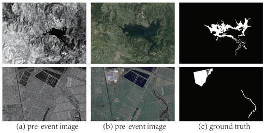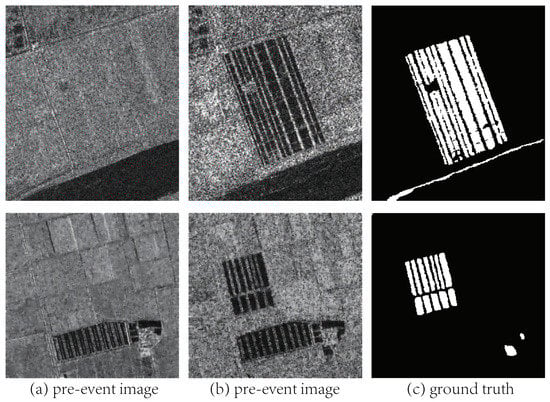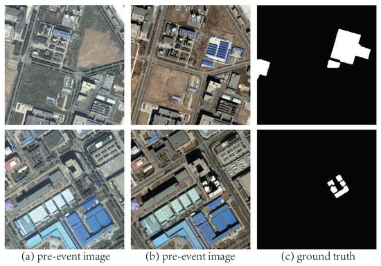 The change detection (CD) of remote sensing images is a technique to extract change information by comparing multi-temporal images acquired over the same geographical area but at different times []. Earth observation technology can provide long-term, wide-area, periodic observations of the Earth’s surface; CD is also one of the earliest and most widely used research areas of remote sensing [], which has also achieved very successful applications in many practical tasks, such as environmental monitoring [], agricultural surveys [], urban studies [], and disaster assessment [].