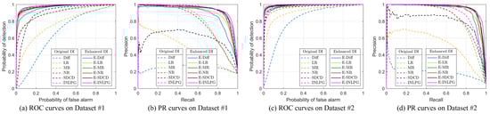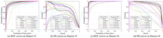 Figure 11 shows the initial DIs and enhanced DIs of Datasets #5 and #6, Figure 12 shows the ROC and PR curves of these DIs, and Table 4 lists the corresponding AUR and AUP. From these results, we can see that the initial DIs all show some change information and, among these DIs, FPMS and INLPG perform relatively better. By comparing the initial DIs and enhanced DIs of Figure 11, two findings can be noted: first, the enhanced DIs generated using GLGDE can cause the change area to be more continuous than the corresponding initial DIs, such as the DIs obtained using SCASC and E-SCASC in Figure 11(f1–f4); second, the GLGDE can effectively suppress the unchanged regions with high change levels in the initial DI, thus reducing the interference of the background area on change detection, such as the DIs obtained using AMDIR and E-AMDIR in Figure 11(b1–b4). The ROC and PR curves in Figure 12 also verify the enhancement of GLGDE on DI and the average improvements of GLGDE in Datasets #5 and Datasets #6 on the AUP metric are 0.276 and 0.236, respectively.