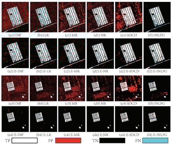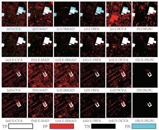 CMs computed from initial and enhanced DIs of Datasets #3 and #4. From top to bottom, they correspond to initial CMs of Dataset #3, enhancement CMs of Dataset #3, initial CMs of Dataset #4, enhancement CMs of Dataset #4. From left to right are CMs generated by: (a1–a4) CVA/E-CVA; (b1–b4) MAD/E-MAD; (c1–c4) IRMAD/E-IRMAD; (d1–d4) DSFA/E-DSFA; (e1–e4) DCVA/E-DCVA; and (f1–f4) INLPG/E-INLPG.