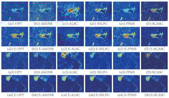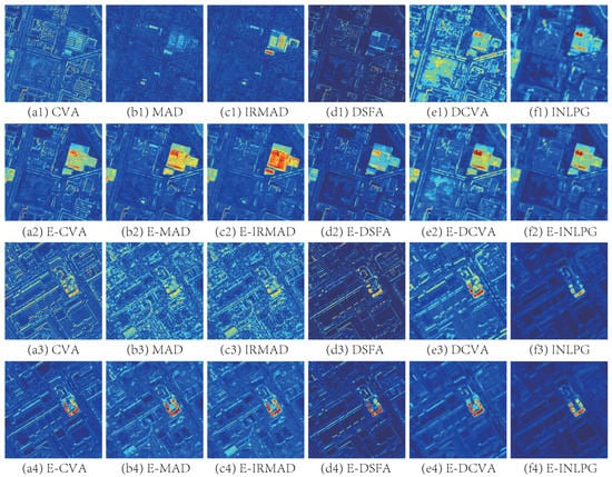 Initial and enhanced DIs of Datasets #5 and #6. From top to bottom, they correspond to initial DIs of Dataset #5, enhancement DIs of Dataset #5, initial DIs of Dataset #6, and enhancement DIs of Dataset #6. From left to right are DIs generated using: (a1–a4) CVA/E-CVA; (b1–b4) MAD/E-MAD; (c1–c4) IRMAD/E-IRMAD; (d1–d4) DSFA/E-DSFA; (e1–e4) DCVA/E-DCVA; and (f1–f4) INLPG/E-INLPG.