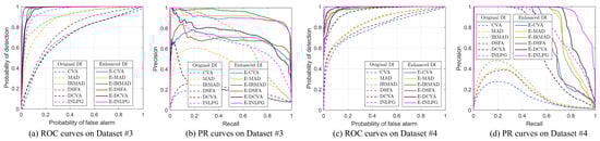 Figure 7 shows the initial DIs and enhanced DIs of Datasets #3 and #4, Figure 8 shows the ROC and PR curves of these DIs, and Table 3 lists the corresponding AUR and AUP. As can be seen from Figure 6 and Figure 7, the seasonal differences in the pre-event and post-event images lead to the poor qualities of the initial DIs obtained by some methods, such as the CVA and DCVA on Dataset #3 and MAD and IRMAD on Dataset #4. By using the proposed GLGDE on these initial DIs, the distinguishability between changed and unchanged is greatly improved, as shown in Figure 7 and Figure 8 and especially illustrated by the PR curves of Figure 8. The average improvements of GLGDE in Datasets #3 and Datasets #4 on the AUP metric are 0.421 and 0.450, respectively.