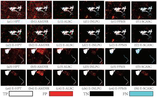 CMs computed from initial and enhanced DIs of Datasets #5 and #6. From top to bottom, they correspond to initial CMs of Dataset #5, enhancement CMs of Dataset #5, initial CMs of Dataset #6, and enhancement CMs of Dataset #6. From left to right are CMs generated by: (a1–a4) CVA/E-CVA; (b1–b4) MAD/E-MAD; (c1–c4) IRMAD/E-IRMAD; (d1–d4) DSFA/E-DSFA; (e1–e4) DCVA/E-DCVA; and (f1–f4) INLPG/E-INLPG.