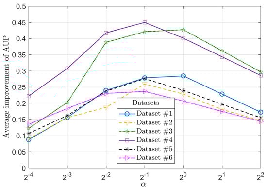 The balance parameters of  and  are used to control the weights of the GFGR and LSGR in the DI-enhancement model (13), respectively. First, in order to cause the GFGR and LSGR to be equivalent (the penalty is balanced), we set , which makes causes the values of  and  to be approximately at the same level. Second, to measure the impact of , we adjust the  from  to  with ratio of 2 and plot the average improvement of the AUP generated using GLGDE with different  in Figure 14. It can be found that too large and too small  are both not suitable: first, if  is too large, the GLGDE tends to over-smooth the DI, causing all the superpixels connected by the constructed graphs ( and ) to converge to the same; second, if  is too small, then GFGR and LSGR cannot play a noticeable effect in the DI-enhancement model, which limits the performance of GLGDE. Based on Figure 14, we fix  in this paper for simplicity.