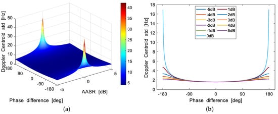 Standard deviation of the Doppler centroid estimates as a function of AASR, and the phase difference of the auto-correlation function of the ambiguity signal and the main signal. (a) . (b) Several given values of .