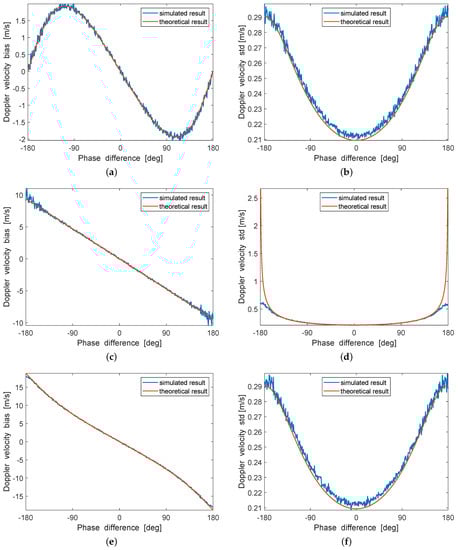 The validation with Monte Carlo simulation is carried out in this subsection. Using the model developed in Section 2, the SAR signals affected by the azimuth ambiguities are generated and the ocean surface Doppler velocities are estimated. The parameters of the SAR system and the signals for simulation are summarized in Table 1. Following the parameters in Table 1, the theoretical results are obtained using the equations in Section 3.