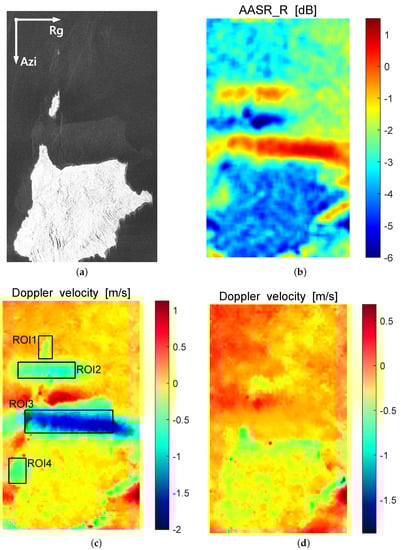 In the bottom and middle part of Figure 4a, a large and a small island on the ocean can be distinguished. Because of the considerable backscatter difference between the ocean and the islands, ghosts due to azimuth ambiguities are well visible in the image. In Figure 4b, it can be found that the estimated AASR reaches 1 dB within this scene, which indicates that the energy of the azimuth ambiguity signal is greater than that of the ocean surface backscatter. Comparing Figure 4c with Figure 4a, obvious ocean surface Doppler velocity estimation anomalies are observed in the area where the azimuth ambiguities are present. It is worth noting that the distribution characteristics of the ocean surface Doppler velocity anomalies in Figure 4c is consistent with that of the estimated AASR in Figure 4b. Moreover, the larger the value of AASR, the higher the degree of ocean surface Doppler velocity estimation anomalies. These features suggest that the ocean surface Doppler velocity estimation bias induced by the azimuth ambiguities is highly correlated with the AASR. As shown in Figure 4d, the estimated ocean surface Doppler velocity is continuous after azimuth ambiguity suppression, which is consistent with the real ocean surface velocity characteristics. Meanwhile, the island boundaries are clearly visible in the ambiguity-free Doppler velocity map.