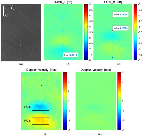 A ship with strong backscatter on the sea and its ghosts due to the first-order and the second-order azimuth ambiguities can be seen in Figure 6a. Comparing Figure 6a with Figure 6b,c, we can find that the two ghosts at the top of the image are due to right azimuth ambiguities, and the ghost at the bottom of the image are due to the left azimuth ambiguity. The estimated AASR in the ghost target regions of ships can reach up to 3 dB as shown in Figure 6b,c. It is worth noting that ocean surface Doppler velocity anomalies appear within ROI5 and ROI6 located between the ship target and its left and right first-order azimuth ambiguities in Figure 6d, while no amplitude anomalies occur at the corresponding locations of the SAR image (see Figure 6a). In addition, the distribution characteristics of the Doppler velocity anomalies in Figure 6d are similar to that of the estimated AASR in Figure 6b,c, which also indicates that the ocean surface Doppler velocity anomalies within ROI5 and ROI6 are due to right and left azimuth ambiguities, respectively. These phenomena imply that the modulation of SAR phase by azimuth ambiguities can lead to a bias in the ocean surface Doppler estimates although the AASR is relatively low in some cases. As shown in Figure 6e, the estimated ocean surface Doppler velocity is continuous after azimuth ambiguity suppression, which is consistent with the real ocean surface velocity characteristics.