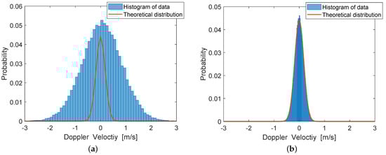 Statistical histograms of ocean surface Doppler velocity estimates (a) before and (b) after azimuth ambiguity suppression. The solid red lines indicate the theoretical distributions of ocean surface Doppler velocity estimates.