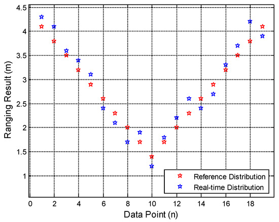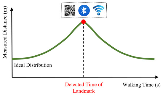 Figure 3 shows that the measurements acquired from the local wireless stations demonstrate regular peaks during the passage of pedestrians. In this part, a universal wireless landmark-recognition approach is presented for the accurate detection of BLE- and Wi-Fi-based landmark points. For real-world scenes, the measured BLE RSS- or the Wi-Fi FTM-based range results are affected by the multipath propagation and NLOS effects, so that the range distribution collected in real time shows fluctuating results, with differences compared to the ideal range-result distribution.