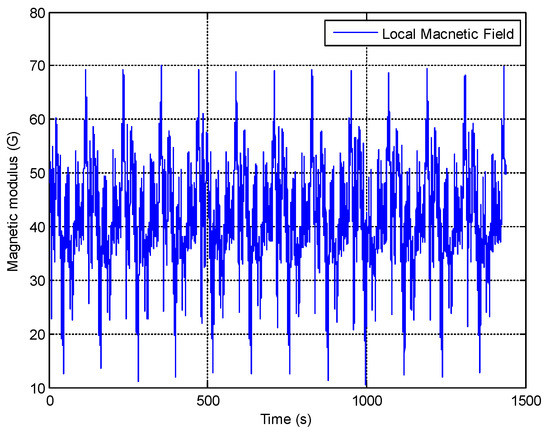 where denotes the first magnetic output epoch under the recognized QSMF period and indicates the attitude matrix at the current moment. denotes the calibrated local magnetic vector, applied as the reference magnetic field: