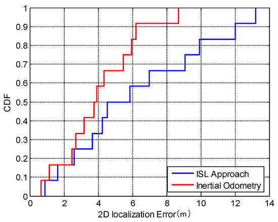 Figure 15 indicates that that there was a cumulative error in inertial ranging as usage time grew, especially when the pedestrians walked across floors. The proposed 3D-WBQM framework significantly reduced the cumulative errors in inertial odometry by fusing multi-source information using a universal fusion approach. A comparison of the CDF errors between the two methods is shown in Figure 16.