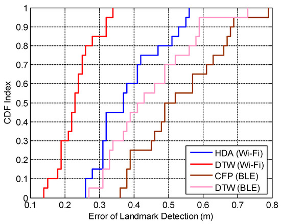 In addition, we conducted a comprehensive comparison of our proposed DTW approach with two different BLE- and Wi-Fi-based landmark-detection algorithms—the hybrid detection approach (HDA) [10] and critical point finding (CPF) approach [43]. The comparison results of Wi-Fi- and BLE-based landmark detection are described in Figure 11.