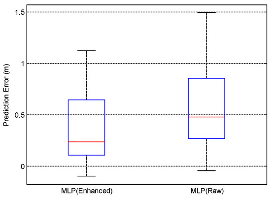 In this work, the crowdsourced trajectories were autonomously evaluated by an enhanced trained MLP error-prediction structure. During the training phase, the data were collected from different indoor environments, inluding the office scene, the corridor scene, and the shopping mall scene. A total of 105 trajectories collected from different scenes were adopted as the training dataset, and after the training phase, the trained error-prediction model was applied to evaluate the localization error of each step period on the same trajectory. The final estimated accuracy of the error-prediction model was compared with the raw MLP model proposed in [8] on the same testing dataset, as described in Figure 12.