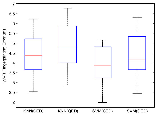 As can be seen in Figure 12, the enhanced MLP model provided better trajectory error-prediction performance, reaching 0.65 m in 75%. The overall trajectory error larger than the set threshold was not considered in the procedure of the final crowdsourced navigation database generation. To evaluate the accuracy of Wi-Fi fingerprinting based on the generated navigation database, the basic k-nearest-neighbors algorithm (KNN) and the support vector machine (SVM) were applied for Wi-Fi fingerprinting classification. In this case, we also compared the performance of two kinds of navigation database: the proposed MLP-enhanced database (CED) and quality-evaluation-aimed database (QED) [9]. A comparison of the final localization accuracy using KNN and SVM is shown in Figure 13.