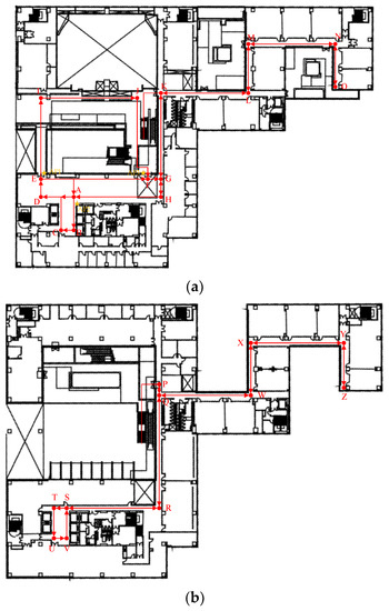 (a) Walking route at 4th floor; (b) walking route at 5th floor. (A–Z indicate the ground-truth turning points of walking route, red arrows indicates the moving direction).