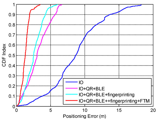 Figure 16 describes the significant improvement of 3D indoor-localization performances using the 3D-WBQM framework compared with a single inertial odometry approach. The overall estimated localization error was within 4.4 m in 75%, using the integration of IO, BLE, and QR; the overall estimated localization error was less than 3.55 m in 75% using the combination of IO, BLE, and QR and crowdsourced Wi-Fi fingerprinting; the overall estimated positioning error as within 1.66 m in 75% using the combination of IO, BLE, and QR, crowdsourced Wi-Fi fingerprinting, and Wi-Fi FTM, especially in the Wi-Fi FTM-supported indoor area, where the localization accuracy reached 1.08 m in 75%.