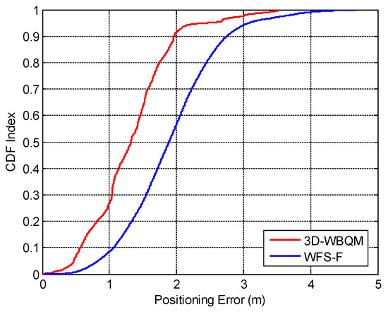 It can be seen in Figure 17 that the presented 3D-WBQM structure achieved higher positioning precision than the WFS-F approach, with the overall positioning accuracy of the two algorithms reaching 1.66 m in 75% and 2.33 m in 75%, respectively. Therefore, the proposed 3D-WBQM framework realized an autonomous and highly adaptive 3D indoor-localization performance than those of other localization approaches, providing a comprehensive solution for large-scale indoor localization.