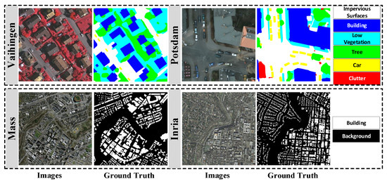 Experimental datasets. The upper, respectively, represents Vaihingen and Potsdam datasets for multi-category UDA semantic segmentation, showing the images and their corresponding ground truth labels, respectively. The lower indicates the Mass and Inria datasets for single-category UDA semantic segmentation.