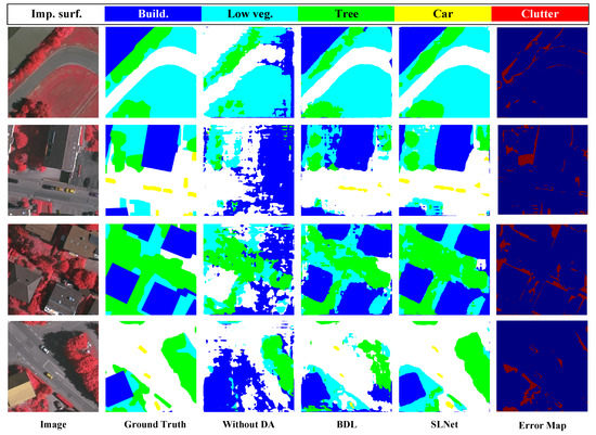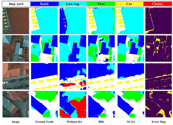 From Vaihingen to Potsdam, we report the quantitative results in Table 2, where the proposed SLNet with ResNet-101 [55] is compared with the other state-of-the-art. We observe that our SLNet achieves the best with mIoU of 62.58%, and mean of 75.85%. Most of the work only focuses on feature alignment from the source domain to the target domain by employing different adversarial losses, where the knowledge of the unlabeled target domain is not fully utilized. The best performance in BDL [25] is still 7.11% worse in mIoU than our SLNet. Compared with BDL [25], we also introduce the image translation model followed by the segmentation adaptation model to further reduce the domain gaps, but the multi-task learning architecture is different. Compared with complex bidirectional learning, sequential learning is more convenient for training and convergence. Meanwhile, there is still a certain gap between the results of our SLNet and the target-only model, which needs further exploration.