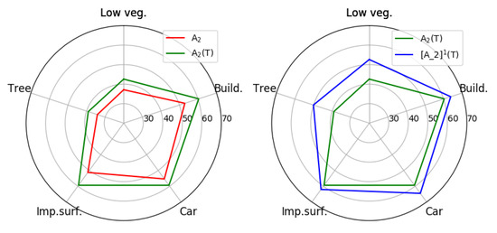 In our experiments, the whole framework is implemented with the PyTorch platform on four Tesla P100 graphics processing units. In the first stage, we choose to employ CycleGAN [13] with nine blocks as our image translation model and add the spectral space transferring module. Limited to GPU memory, the images are cropped into by applying random operations. When training the spectral-based image translation model, the initial learning rate is set to , and decreased with the ‘lambda’ learning rate policy. The whole network is optimized with the ‘Adam’ optimizer for 20 epochs. In the second stage, the DeepLab V2 [11] with ResNet-101 [55] pre-trained on the ImageNet dataset [61] is adopted as our segmentation adaptation model. Following [62], we introduce an output space discriminator with five convolution layers, in which the channel numbers in each layer are , respectively. When training the network, we employ a stochastic gradient descent (SGD) [63] with weight decay 0.0005 and momentum 0.9 as the optimizer. The initial learning rate is , and multiplied by with . In addition, the initial learning rate in the output space discriminator is set to with a momentum of 0.99. Following the previous work [8,30], we comprehensively validate the performance of the model by a total of two common evaluation metrics: Intersection over union (IoU) and score. It is noteworthy that we count the metrics for all categories except clutter in the multi-category UDA semantic segmentation.