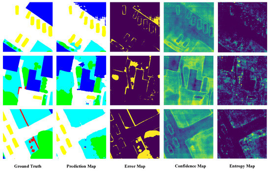 where and indicate the probability distribution of generated by the classifiers and , respectively. It is worth noting that the more different the distributions provided by the two classifiers are, the larger their entropy values. Compared with classical pseudo-label learning, the proposed pseudo-label revising based on entropy minimization (shown in Figure 6c) utilizes the discrepancy entropy map as the automatic threshold to guide the PLL process.
