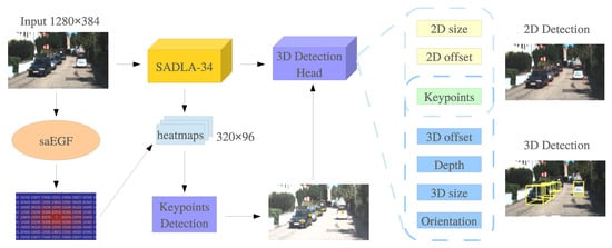 Architecture of the proposed 3D object detection pipeline. A single image serves as input of this framework and will firstly be processed in the SADLA-34 backbone for feature extraction. The outputting heatmaps will be used to detect keypoints of objects, according to the ground truth generated by saEGF module. The predicted keypoints will be inputted into 3D detection head to generate 3D bounding boxes with other regressed 3D properties. Additionally, 2D object detection can also be implemented in this pipeline.