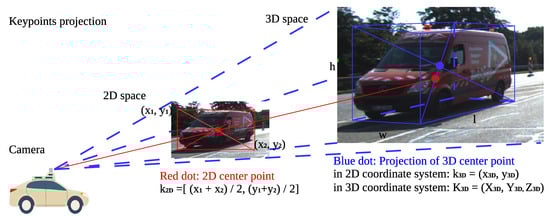 Keypoint3D makes 3D projected keypoint detection for accuracy guarantee. The 2D object detection method also serves as an additional task for verifying the basic detection performance of our proposed model. Since there is always a gap between the 2D center and 3D projected points. On the basis of predicted 3D keypoints in 2D coordinate system , we designed two offsets for 2D center points . The transformation equation is shown in Equation (8).