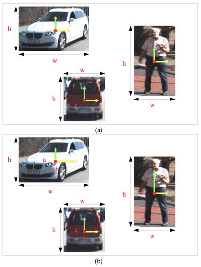 However, the contrast between 0 and 1 set in heatmaps is so sharp, which increases the difficulty of keypoints localization. Therefore, we used the Gaussian filter to apply a Gaussian blur processing, where the values of pixels around keypoints are gradually varied from 1 to 0, while the traditional methods [,] make Gaussian blur processing within a circle area around keypoints. Nevertheless, almost all the ground-truth boxes on 2D images are rectangles, instead of squares. Thus, it is better to use the self-adapting ellipse shapes to locate keypoints of objects, as shown in Figure 3. To be more specific, (a) presents the traditional Gaussian filter to locate keypoints of objects, which definitely performs worse on rectangular objects due to the restriction of algorithms. We improved the traditional Gaussian algorithm to be more self-adapted for rectangular shape objects in (b), which generally occupy the majority among all the objects. Different from the radius of circles r, the proposed self-adapting ellipse Gaussian filter (saEGF) has two Gaussian kernel radii a and b, which are equally scaled from the corresponding ground-truth boxes. Then, we obtain the object size-adaptive standard deviation and . The self-adapting ellipse Gaussian kernel (saEGF) is defined in Equation (2), where and represent the ground-truth keypoints; denotes the saEGF kernel on the heatmap of channel c.