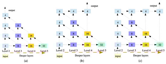 The modified SADLA-34 backbone structure is illustrated in Figure 5. After a base layer, our proposed SADLA-34 can be divided into six levels from to . and layers share the same structure body, but the convolution stride is set as 2 in the layer. From to layers, the convolution structure body starts to contain the downsampling layers and the ResNet structure [] to enlarge receptive fields and fuse multi-scale feature maps. In and layers, we also deepened the backbone network to extract more locating information for keypoints. The hierarchical aggregation structure used iterative deep aggregation to symmetrically increase the feature maps resolution and fused different hierarchical features at different layers.