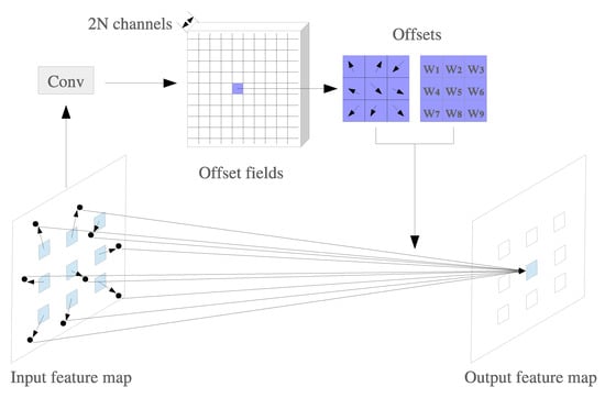 Traditional neural networks used conventional convolution kernels to extract features at areas of the same size. However, traditional convolution operations cannot counter space affine transformations, such as translation, rotation, scaling, crop, and projection, leading to an unstable detection performance. To extract effective features and achieve more robust results from complex autonomous driving scenes, deformable convolution network (DCN) [] is adopted to our backbone network for a great improvement of receptive field. As is shown in Figure 6, the DCN module adds 9 learnable offsets of the deformable convolution kernel, which makes it possible for searching more valuable features on a larger convolution scale. These additional learnable offsets can be updated through gradient descent algorithm such as the parameters w and b in traditional CNN operators. In addition, the new generated offsets variables will be arranged in feature maps of channels, waiting for the next DCN operation. DCN possesses a lightweight structure that does not significantly increase the number of parameters and FLOPs in the model. We used the DCN to replace traditional convolution operations at each upsampling layer.