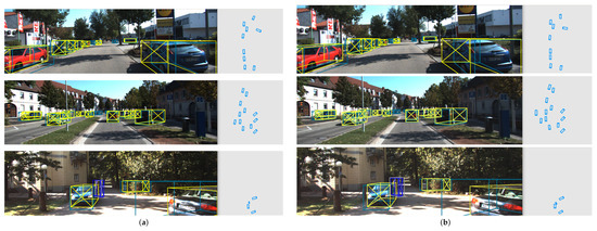 For practical applications in autonomous driving scenes, we evaluated 3D and BEV detection performance and presented the visualization on the KITTI test set. The detection results of (a) our baseline work CenterNet [] and (b) Keypoint3D are shown in Figure 10. The differences in 3D object detection performance between the two models are more clearly represented on the corresponding BEV images. The shows a lost target in the baseline work. The shows a better yaw angle regression performance of vehicles. The further demonstrates the better recall and yaw regression ability of our Keypoint3D. Hence, through the above comparison in detail, our proposed work Keypoint3D achieved an overall improvement with the proposed strategies.