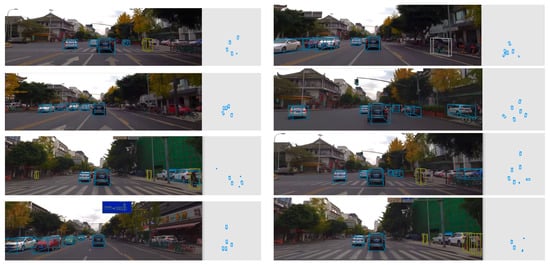 To test the generalization ability of the proposed Keypoint3D, we applied the trained model in real autonomous driving scenes. We used the real traffic scenes data from a driving vehicle equipped with a monocular camera in Chengdu, China. As shown in Figure 11, we can see 3D detection performance and corresponding results in Birds’ Eye View (BEV). The pale blue, brown, and gray boxes represent cars, pedestrians, and cyclists, respectively. Except for the missing detection in dark corners of images, 3D detection results are acceptable for a real-time testing in real application scenes.