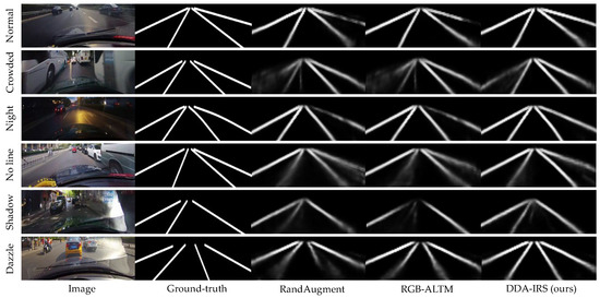 In addition, two data augmentation methods for lane line detection are replicated on the baseline model [52,54]. Table 2 compares the F-measure performance of the three models on the CULane dataset. The results show that DDA-IRS outperforms the other two data augmentation methods, particularly achieving better detection results on the challenging categories of “Crowded”, “Shadow”, “Dazzle”, “Curve”, and “Crossroad”. Compared to the better F-measure of the other two data augmentation methods under each category, the proposed DDA-IRS is still 0.2%, 0.8%, 1.9%, 1.1%, and 0.8% higher under “Normal”, “Crowded”, “Shadow”, “Dazzle”, and “Curve” respectively. Of these, “Crowded”, “Shadow”, and “Dazzle” are the main scenes simulated by DDA-IRS, and the lane lines in these scenes are highly implicit or even invisible, demonstrating the effectiveness of DDA-IRS.