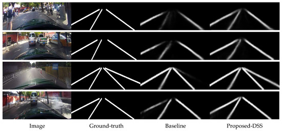 Figure 4 shows the visualization of the test results containing a large number of shadows. In the testing images with a large number of shadows, the lane lines are mostly indistinct or even invisible. The results show that DSS effectively solves the problem of blurry and incomplete lane line detection in shaded scenes. On parts of the lane lines closer to the horizon, the predictions are more accurate, which improves the phenomenon of lane lines in the distance disappearing to a certain extent. Better still, DSS also solves the problem of missed detections that exist in a normal scene to a certain extent. In summary, the DSS strategy is effective in improving lane line detection results, especially for the shaded scene.