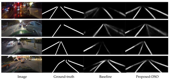Efficacy of DSO: For road environments where lane lines are heavily obscured, such as congestion, it is important to detect lane lines under obscuration. To verify the performance of DSO, we added multi-size boxes to the training images to enhance the data with a probability of 0.2 individually and recorded the experimental results in Table 3 under “Proposed-DSO”. A comparison of the proposed DSO and baseline shows that the lane line labels are usually not accurate enough in the testing images with heavy occlusion. The data-enhanced model with DSH has different degrees of improvement for the four categories of “Normal”, “Night”, “Shadow,” and “Crossroad”, with the F-measure improving by 0.2%, 0.5% and 0.6% for the “Normal”, “Night”, and “Shadow” categories respectively, while ensuring that the F-measure remains the same or decreases slightly for the other categories. Moreover, the value of the F-measure is improved in general by 0.1%. The drop in F-measure for the “Crowded” category is explained in the visualization results.