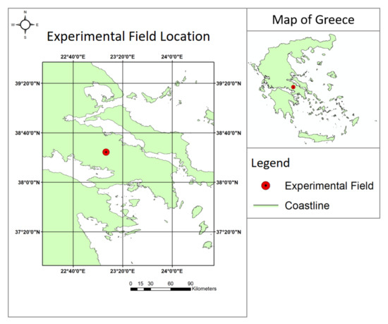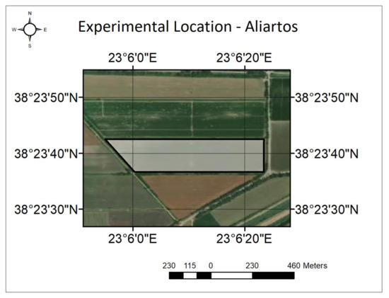 The relative location of the experimental area for this study, located in Aliartos, Greece. The geographical coordinates of the area are 38°23′40″N, 23°6′10″E, and the elevation is 265 m above sea level (ASL).