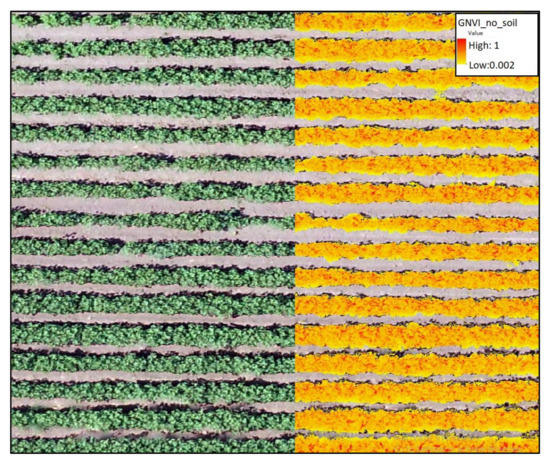 In addition to each generated 3D map, three (3) different vegetation index maps, namely the Green Red Vegetation Index (GRVI), the Green Chlorophyll Coordinate Index (GCC), and the Normalized Excessive Green Index (NExG) were also generated using the ArcMap software v10.2.2 from the orthomosaic images created from the dense point clouds (Table 1). These vegetation indices contrast the green portion of the spectrum against red and blue ones to effectively distinguish vegetation from soil, while also quantifying crop vigor and thus providing information regarding the plant’s health status, such as chlorophyll content and leaf area coverage. These VIs in most development stages normally exhibit a linear relationship with the photosynthetic capacity of crops, which also varies throughout the growing season, and can therefore be helpful in crop monitoring and agricultural management. Moreover, another reason these indices were selected is due to their ease of implementation in imagery data obtained in the visible spectrum (RGB images), which is one of the main objectives of this study as we have focused entirely on a low-cost sensing system approach.