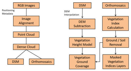 For each individual vegetation index map, a variable filter was applied to isolate pixels corresponding to cotton vegetation, removing soil and other “background” elements from the images (Figure 4), using ArcMap. These filters were selected manually for each VI layer and data collection date, as variations in the histogram distribution and value range of each date would not allow for a constant threshold value to be used for all dates and VI layers. To this end, numerous points of both soil and vegetation pixels were examined throughout the field, obtaining a general idea of the value ranges of cotton vegetation and the background pixels (soil or other elements such as weeds) that we wanted to separate. The final masked layers were generated by applying 5–10 iterations of threshold values near these identified “separation” values for each VI layer and then selecting the one that better-masked cotton pixels (performed by overlaying each masked layer over the RGB orthomosaic). Finally, the ground cover was calculated by applying a binary mask that also served as a filter for the vegetation pixels, this time to the 3D height data (DSM). After the vegetation pixels were isolated, the percentage of remaining pixels to the total number of pixels within the polygon boundaries of a reference grid (cell dimensions 10 × 10 m2, described in the following section) were calculated as Coverage. The entire workflow is shown in the following graphic (Figure 5).